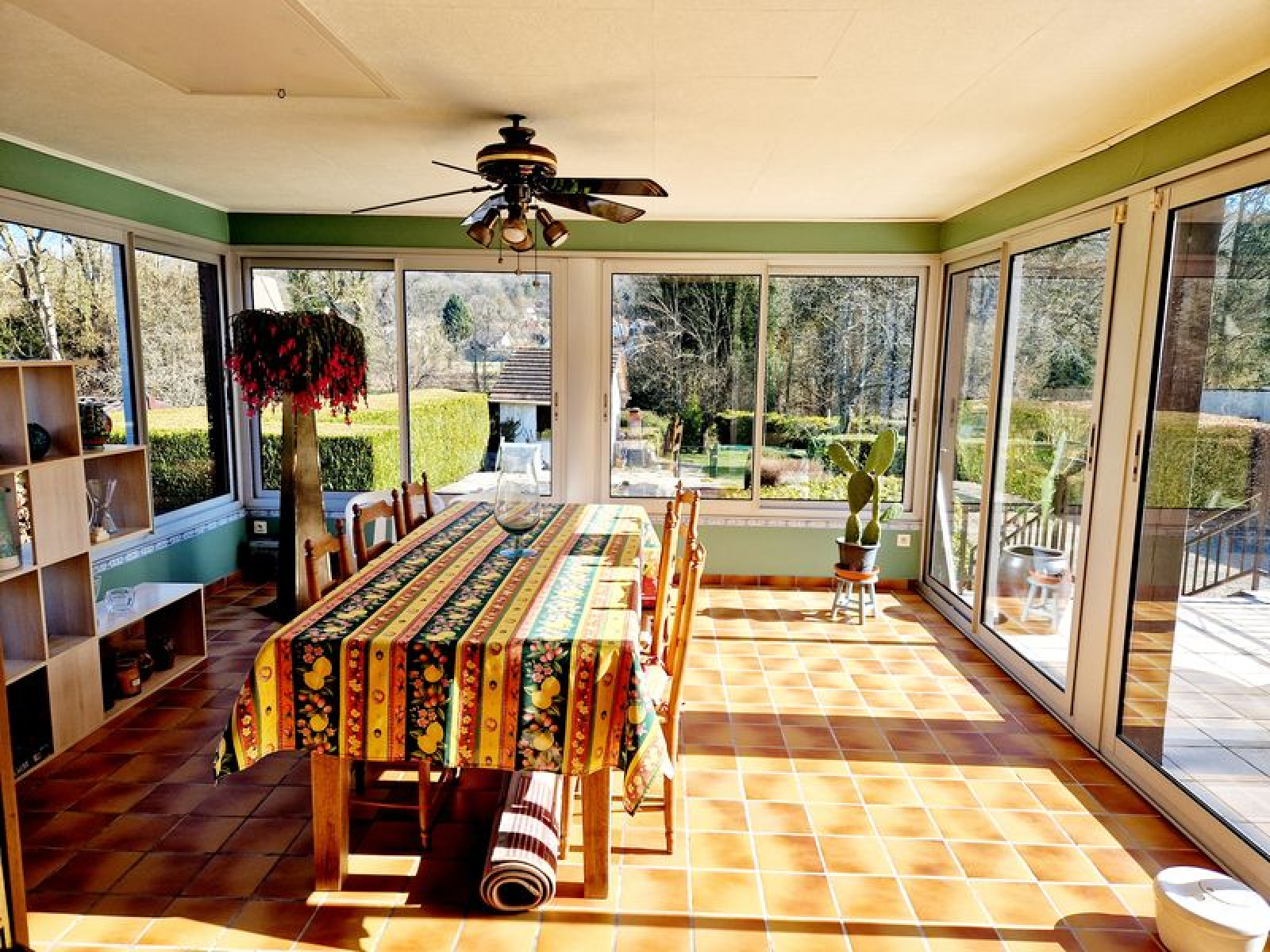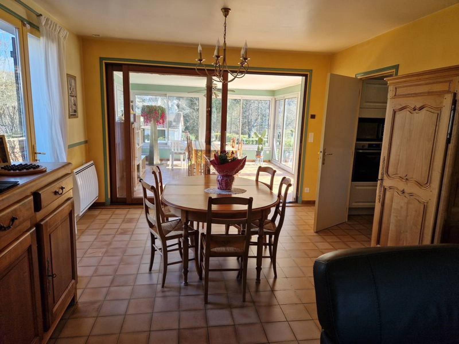 - au rez de chaussée: entrée avec placard, grand séjour (35 m²) avec cheminée, véranda avec toit en dur, cuisine équipée, 2 chambres, salle d'eau, WC, terrasse.